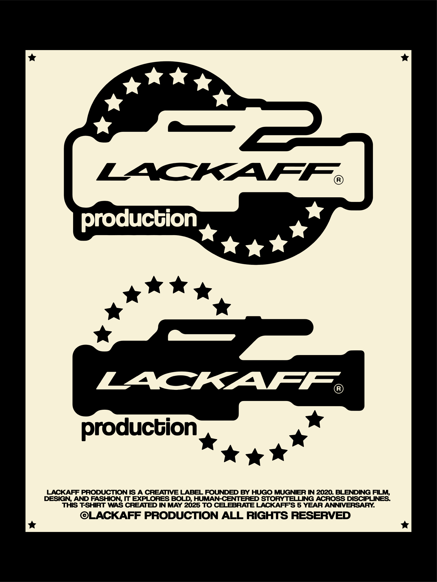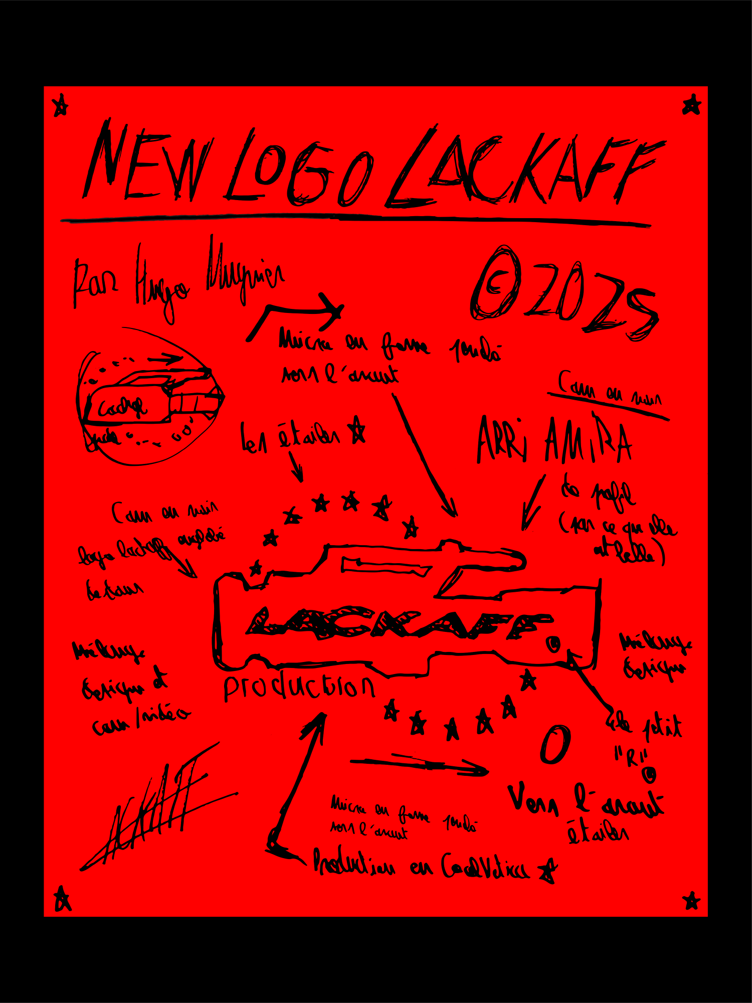 Pour l’anecdote, la caméra utilisée pour ce logo est une ARRI Amira avec un Fujinon 19–90. J’ai juste retravaillé la partie supérieure, un peu inspirée de la Sony FX6 et de sa poignée, surtout pour donner de l’élan au logo et retrouver des angles cohérents avec le “L” de Lackaff. Ensuite, les petites étoiles, le “Production”… et bam.