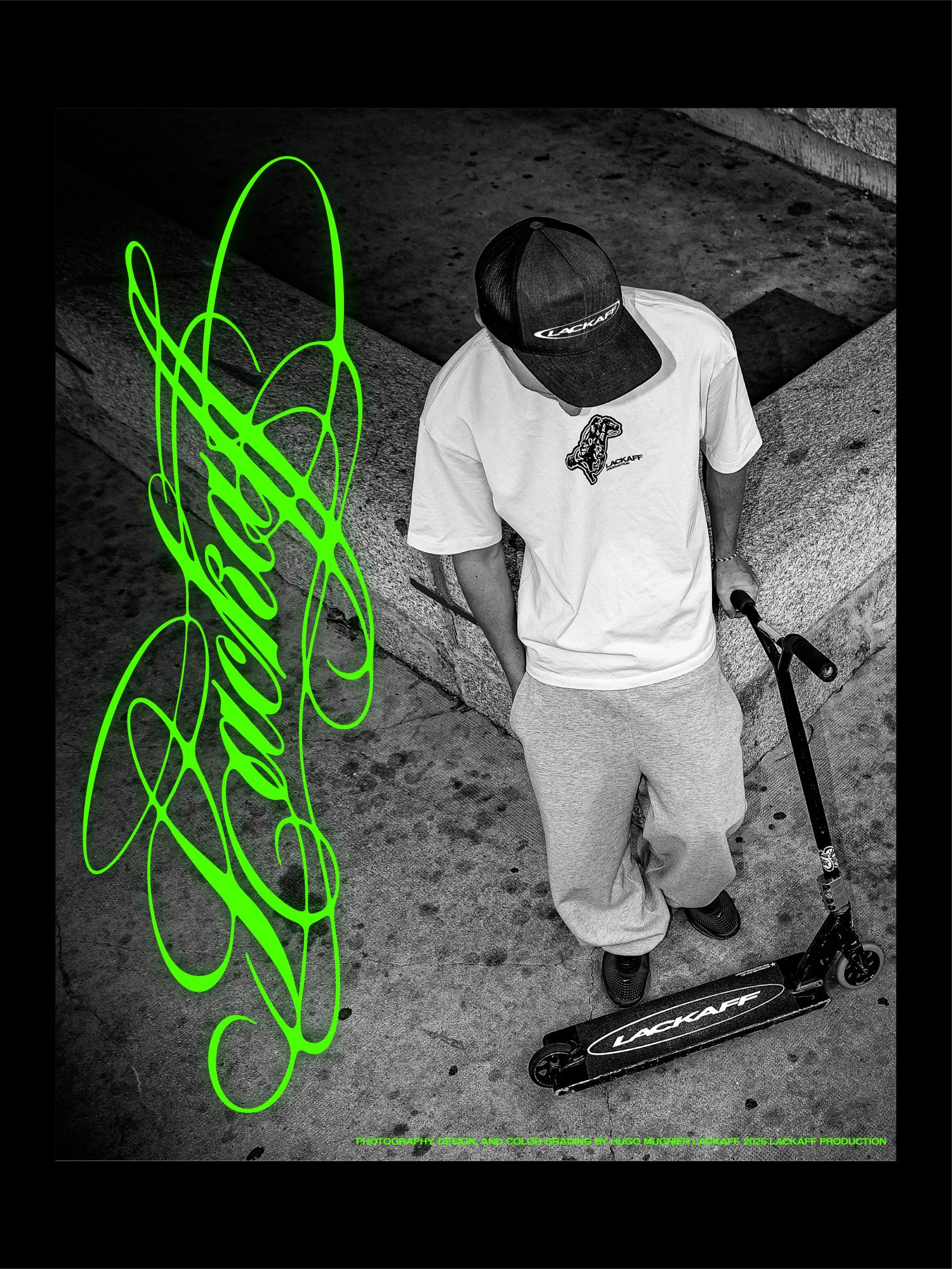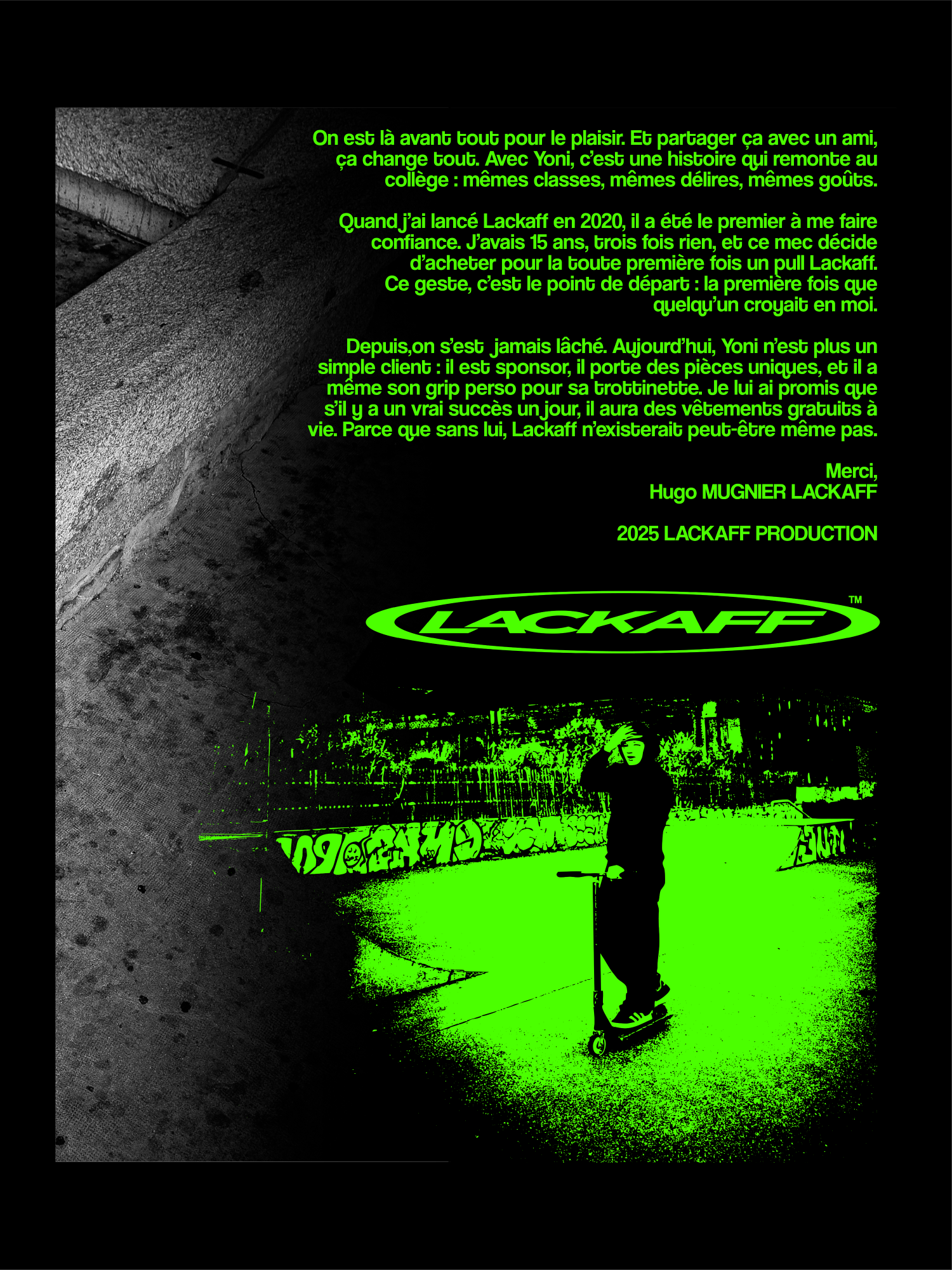 Depuis, on s'est jamais lâchés. Aujourd'hui, Yoni n'est plus qu'un simple client : il est sponsor, il porte des pièces uniques, et il a même son grip perso pour sa trotinette. Je lui ai promiss que s'il y a un vrai succès un jour, il aura des vêtements gratuits à vie. Parce que sans lui, Lackaff n'existerait peut-être même pas."