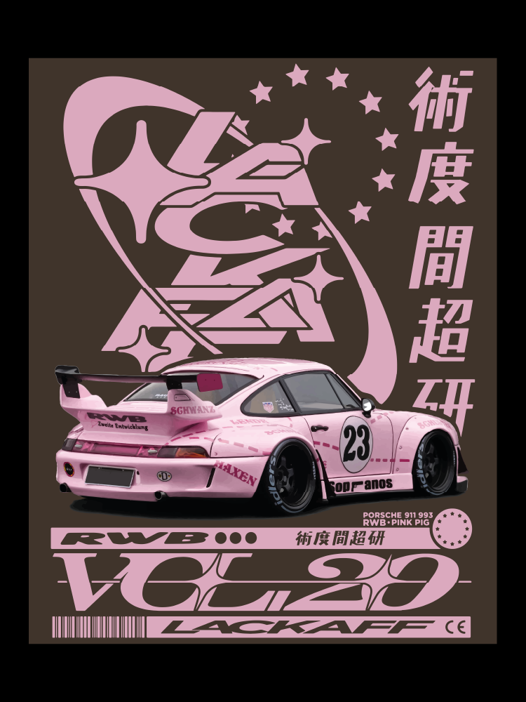 C’est aussi l’une de mes voitures préférées : une Porsche 911 (type 993) avec pack RWB et la fameuse peinture Pink Pig. Ce rose vient d’une tradition historique chez Porsche, d’abord utilisé sur la 917 aux 24 Heures du Mans 1971, avec des lignes représentant des découpes de viande, d’où le surnom.