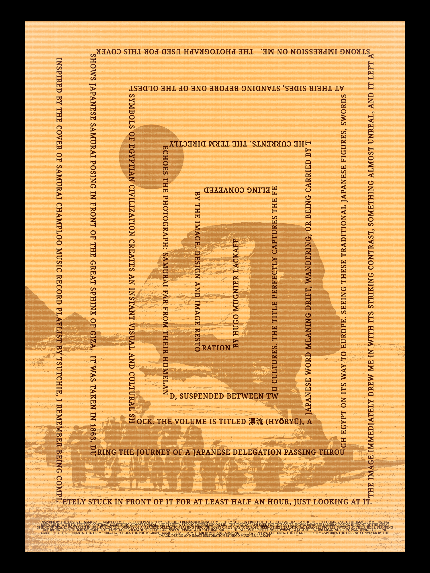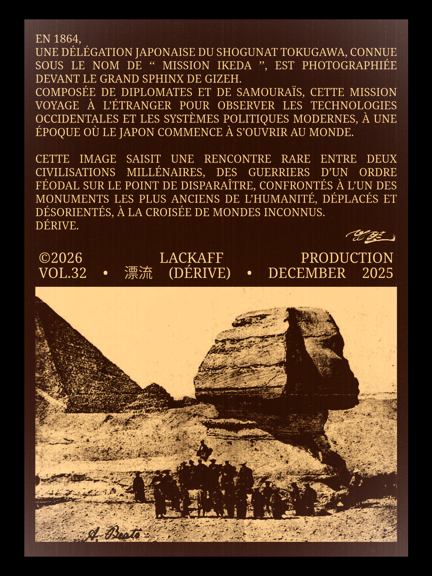 Tout commence en juin 2025, quand j’écoute l’album "Samurai Champloo Music Record" de TSUTCHIE, sorti en 2004. Bien sûr, la musique est sympa, mais ce qui m’a le plus frappé, c’est la cover : cette fameuse photo des samouraïs devant le Sphinx. Je me souviens que j’étais complètement obsédé. Pendant deux bonnes semaines, je réécoutais les morceaux de l’album uniquement pour voir cette cover.